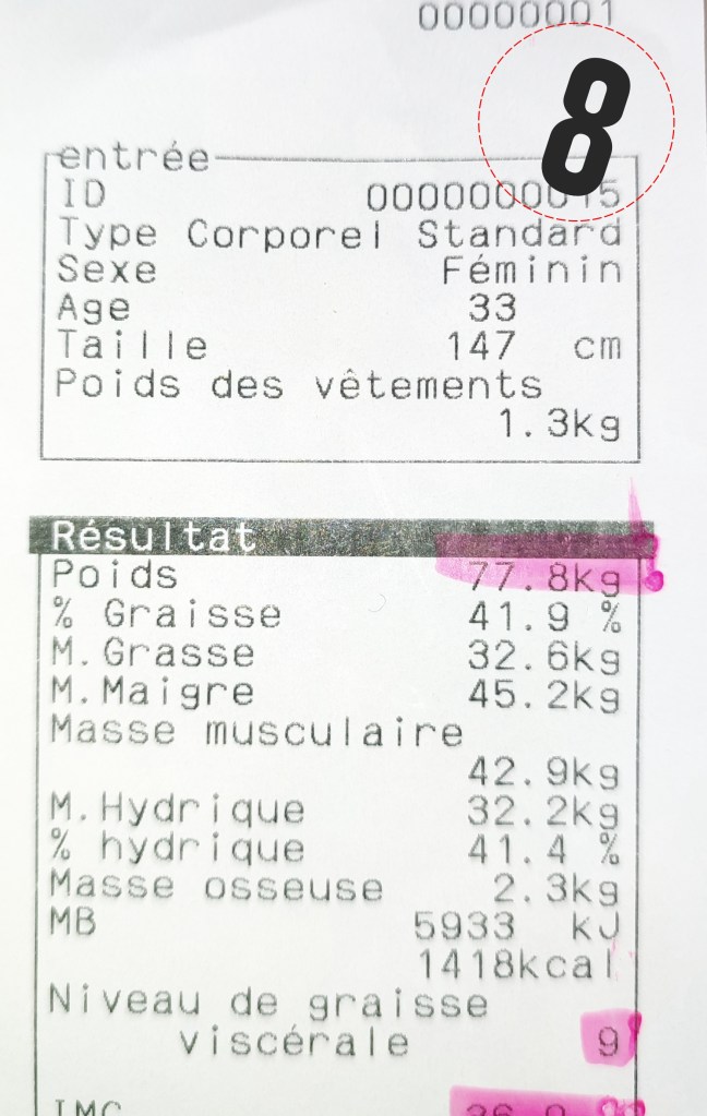 Donc c’est une très bonne surprise malgré tout. Il m’indique que je suis à une perte de 10 kilos depuis le début de notre suivi, et mon IMC est aujourd’hui de 36. Soit, une perte de 5 points. Il m’a dit, que les 5 points d’IMC pour une personne de MA taille (1,47), c’est vraiment pas courant, car c’est en général ce que les personnes vont perdre sur un an de suivi. C’est pas une course attention, mais je pense que c’est sa façon de m’encourager à ne pas relâcher ma nouvelle hygiène de vie. Timidement je lui ai dit merci, mais il m’a répondu que je suis la seule à remercier, puisque tout ne pouvait pas fonctionner sans ma détermination.