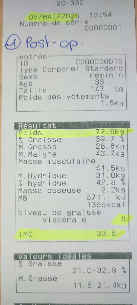 Ok, on n’est pas à un mois post-op, mais il faut que je compte ça comme le premier mois, sinon ça va être la misère : l’opération était un 23 sauf que mes suivis se font autour du 5-8. J’compte absolument pas m’peser à la maison, mes suivis depuis juillet 2024 se font chez le Dr Bois*. En plus, se peser chaque semaine, c’est clairement anxiogène je trouve, mais soit, chacun fait comme il le veut, et si les autres trouvent leur compte ainsi, tant mieux.