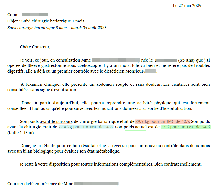 – Vous voyez, déjà dans le parcours vous aviez perdu 10 kilos. Non, 12 kilos. C’est énorme de perdre 6 points d’IMC pour une personne de votre petite taille.